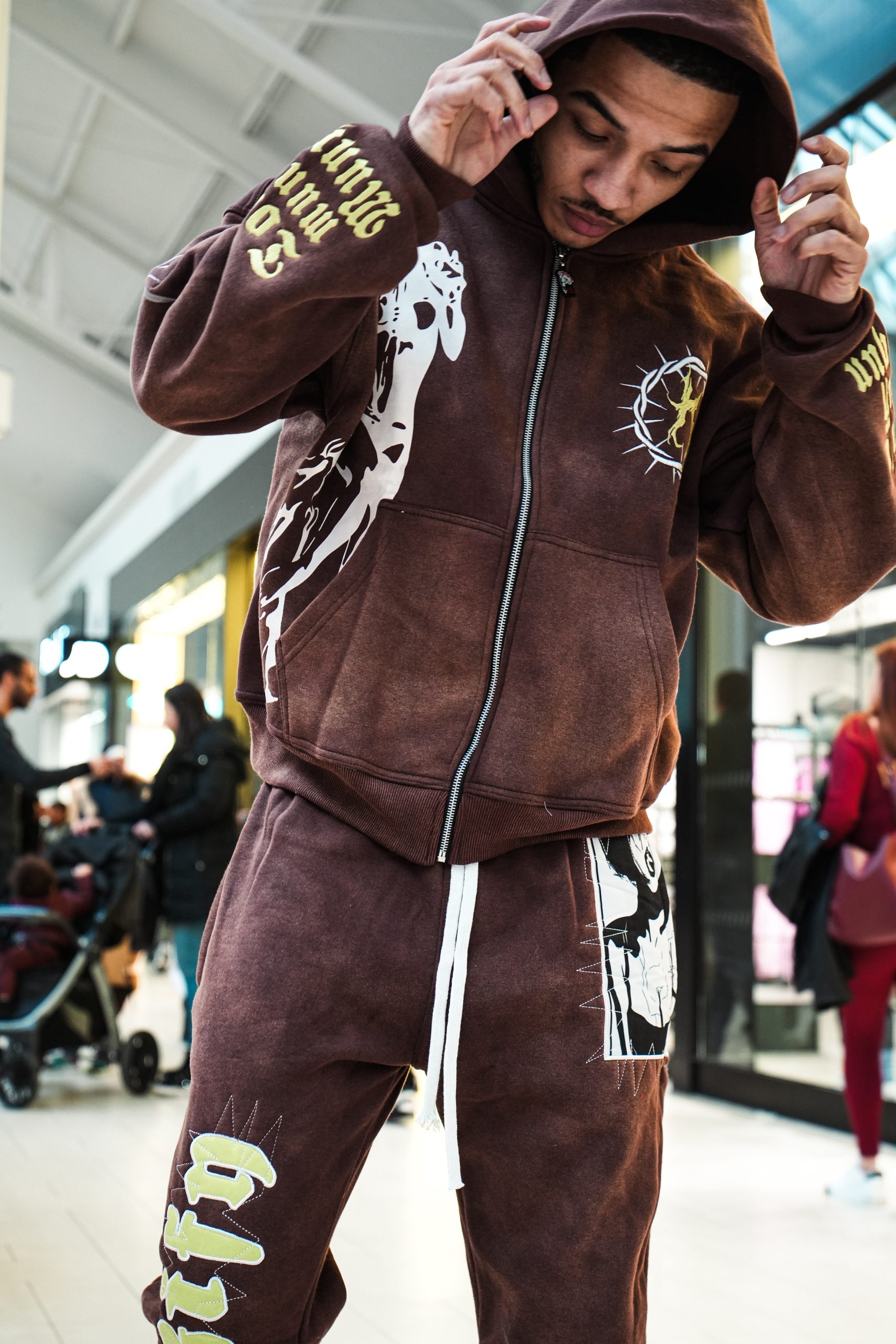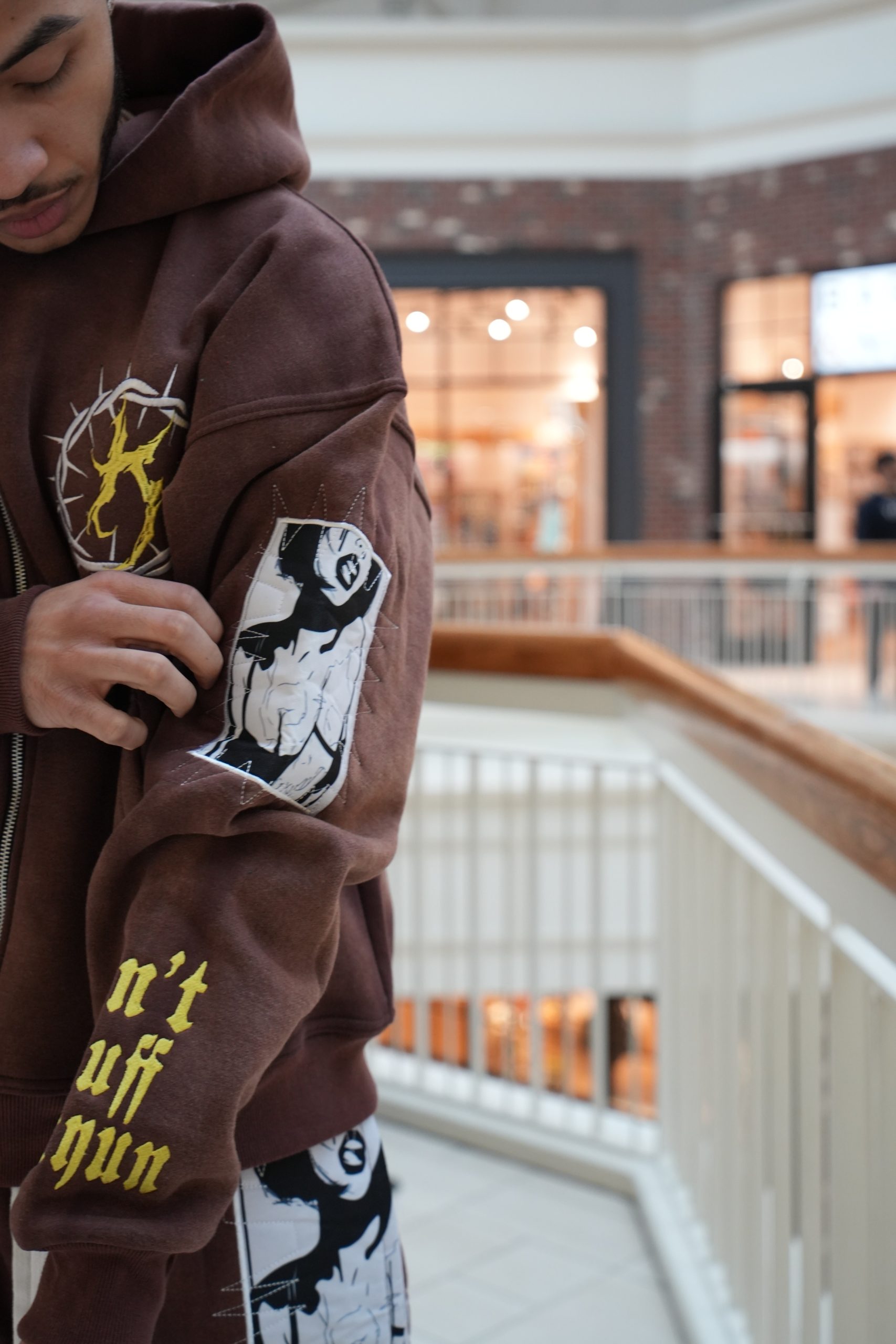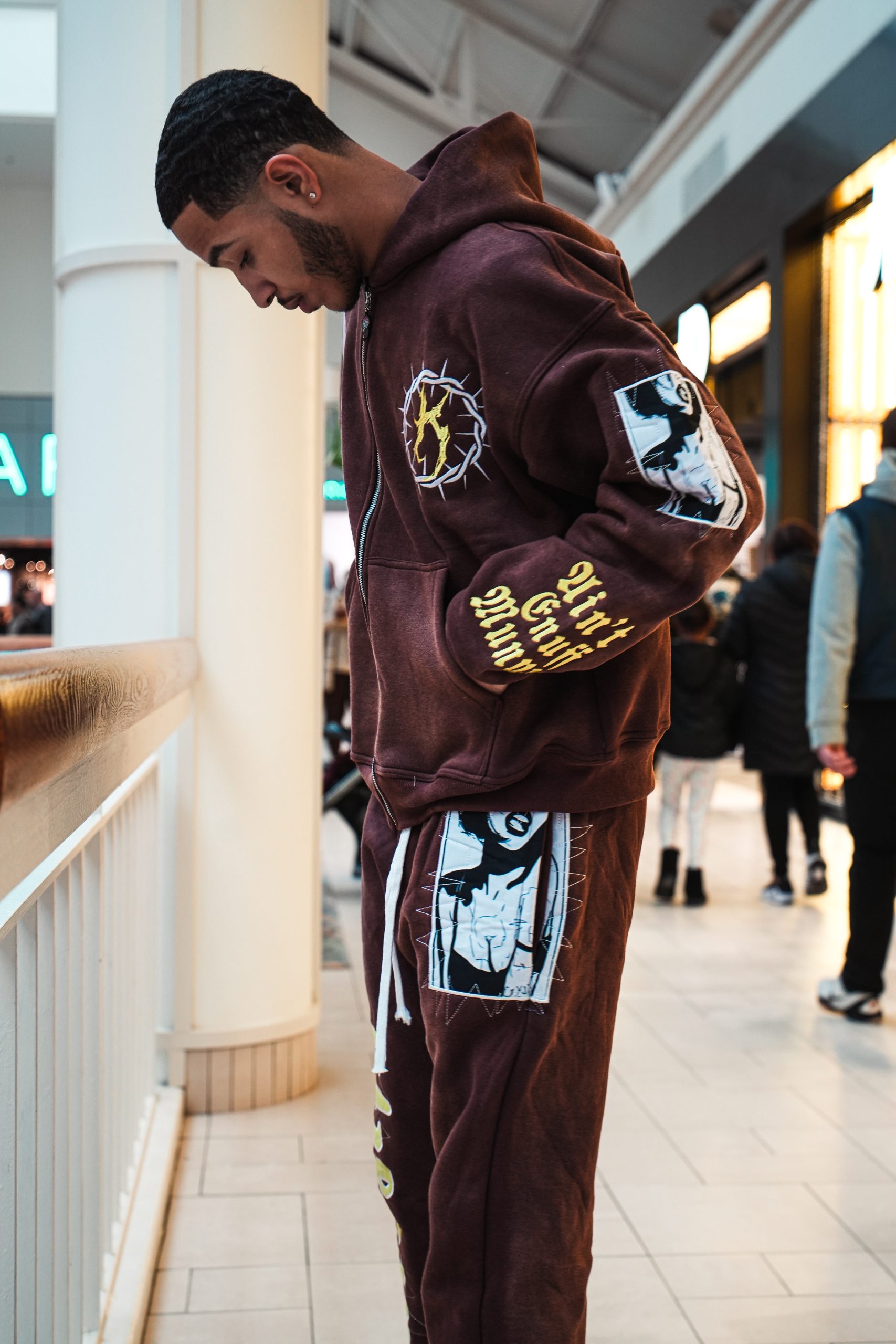 This is a 100% Cotton set, with embroidery designs throughout. IE: “Too much munyun” on the right sleeve; “Aint enuff munyun” on the Left. “Ladies Love Kruzify” on the back, and Much MORE. Pants include long drawstrings. Extra pocket on the back of them. Truly a Piece of Art. A must-have for this season.