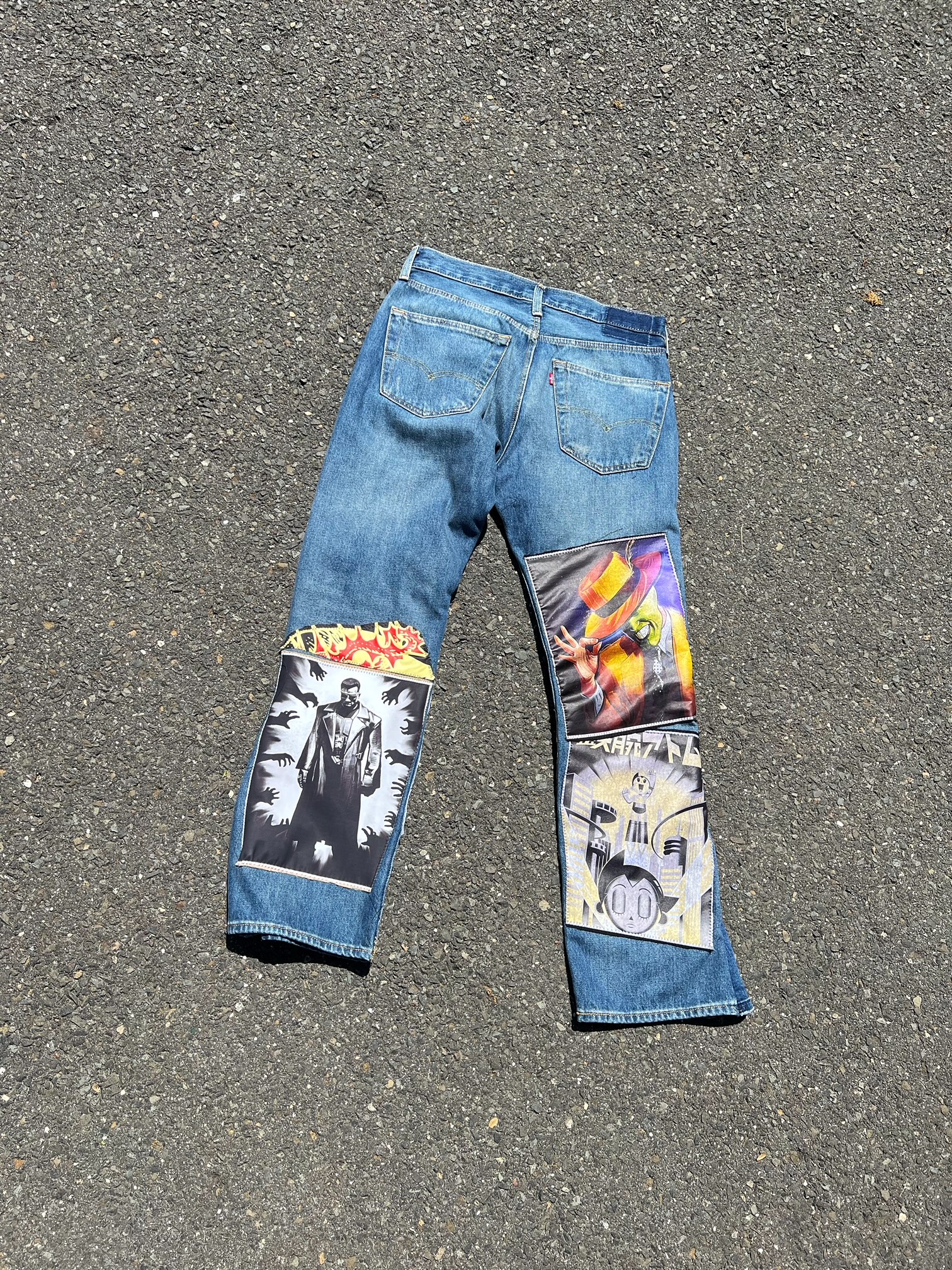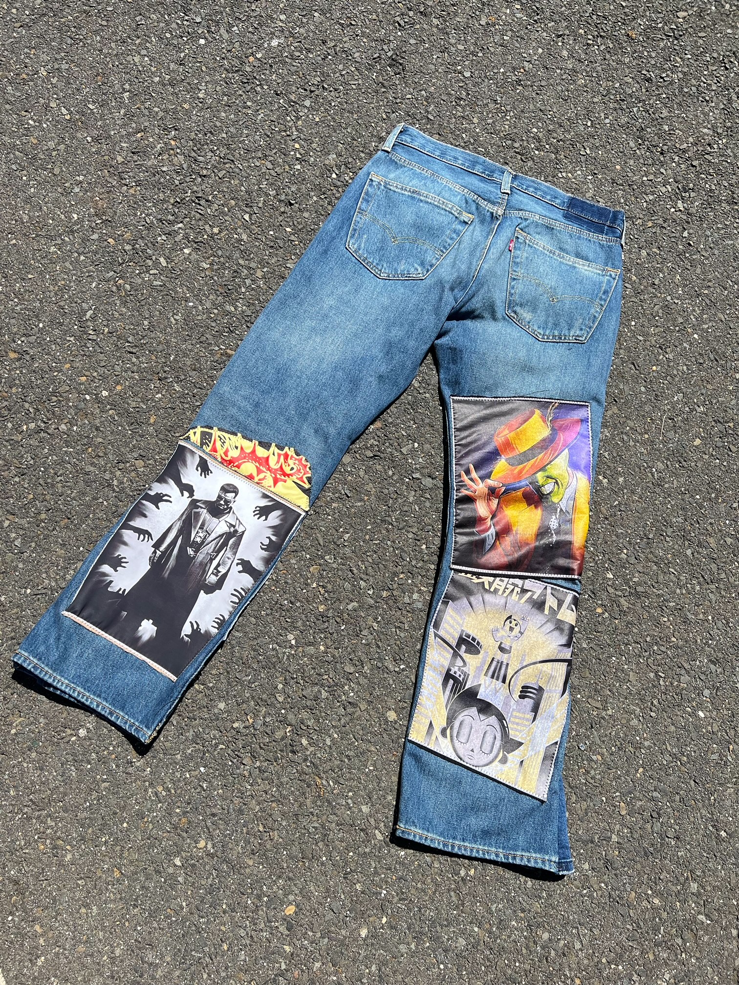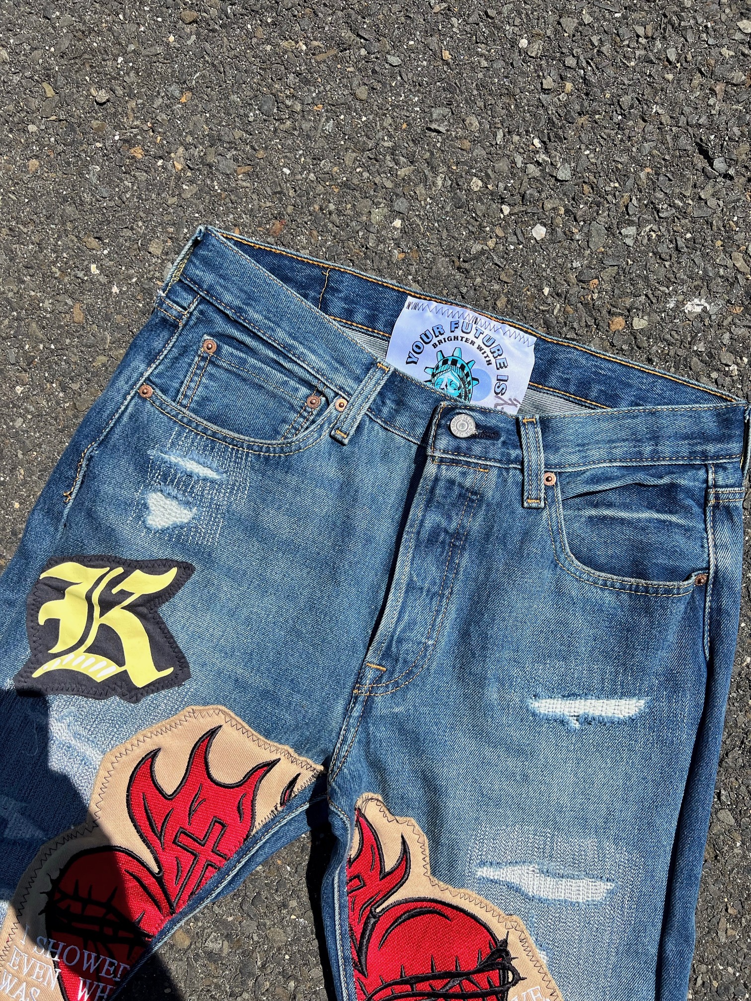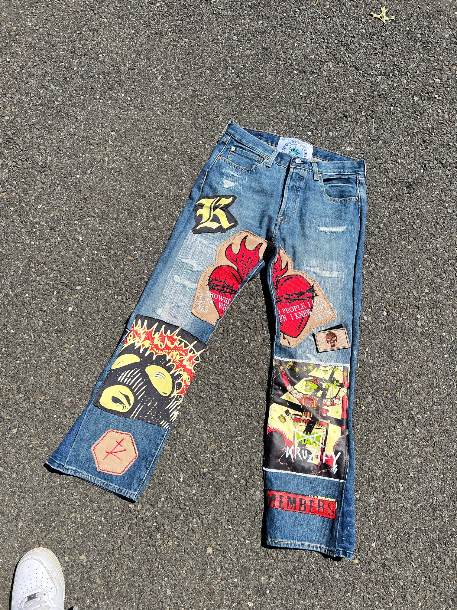 These custom jeans are designed by KRUZIFY. Jeans are purchased brand new (never worn), (Levis 501) and customized. Truly an Art piece. The heart shaped patch quotes “I showed people love, even when I knew they was Hatin“. We have our staple logo design. “The Mask, Blade, & Astro boy” are also incorporated throughout. Flared bottoms. 1 of 1.Â