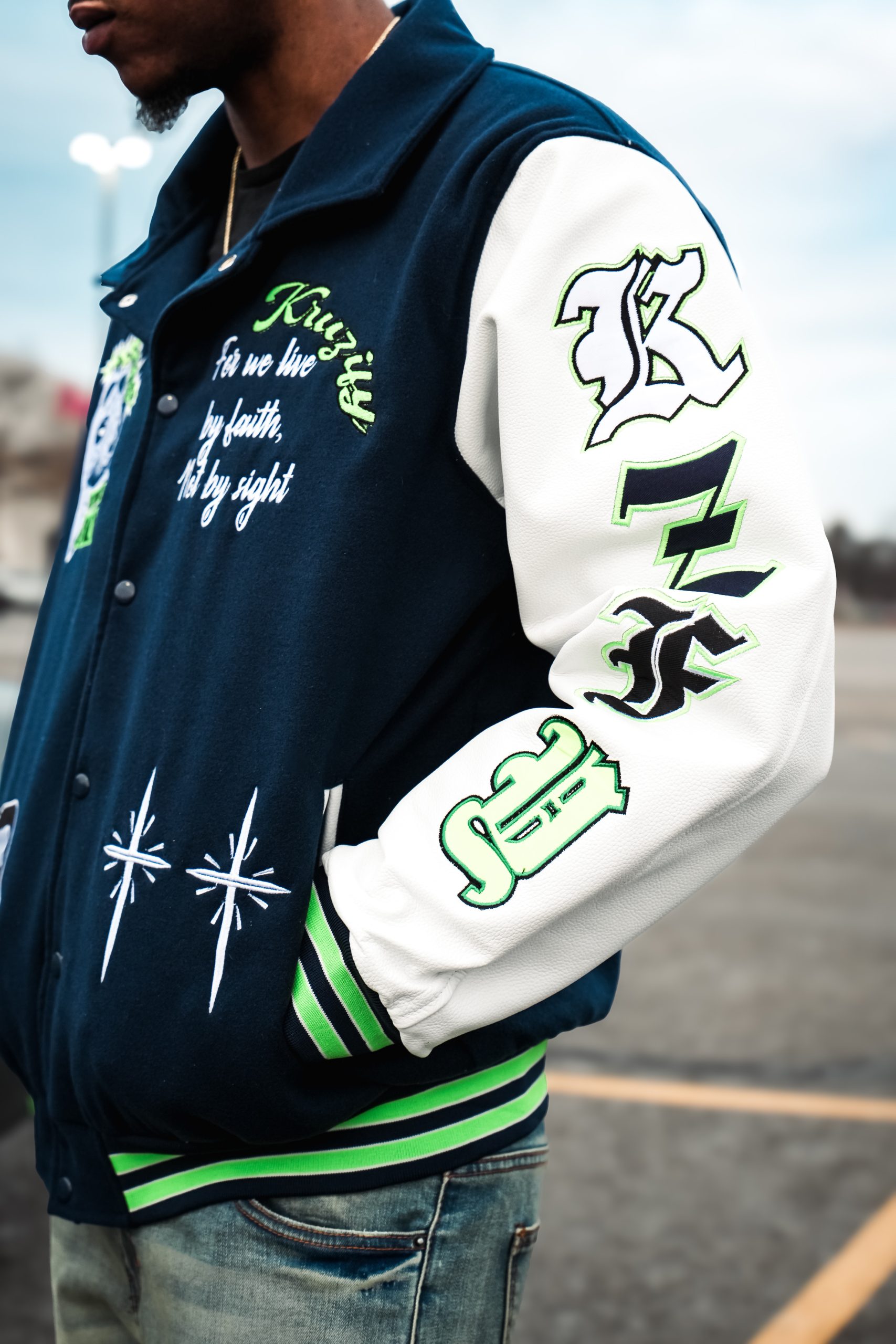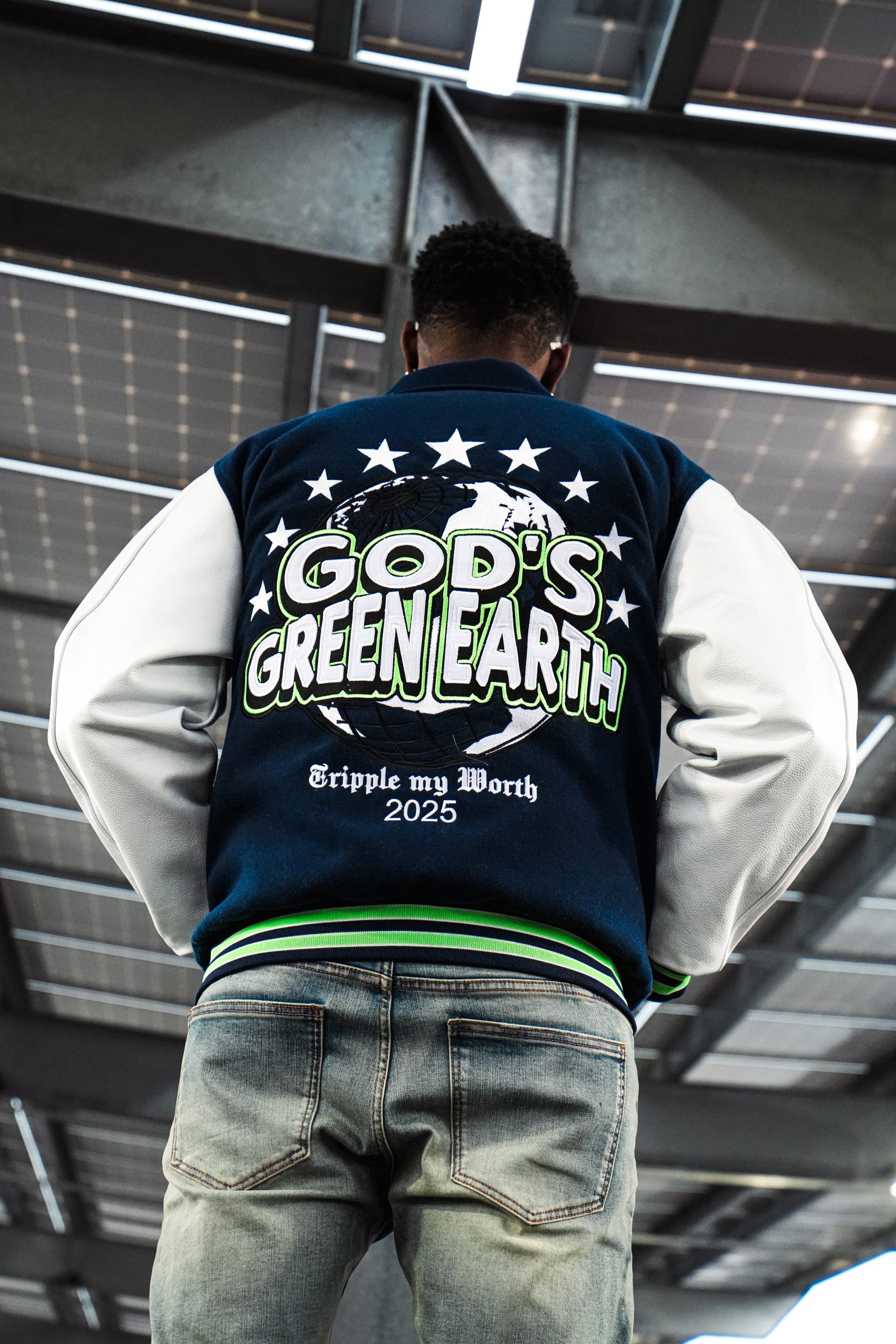 Our ‘Gods Green Earth‘ Varsity. Genuine cow leather sleeves, Wool body. Embroidery patches through-out.