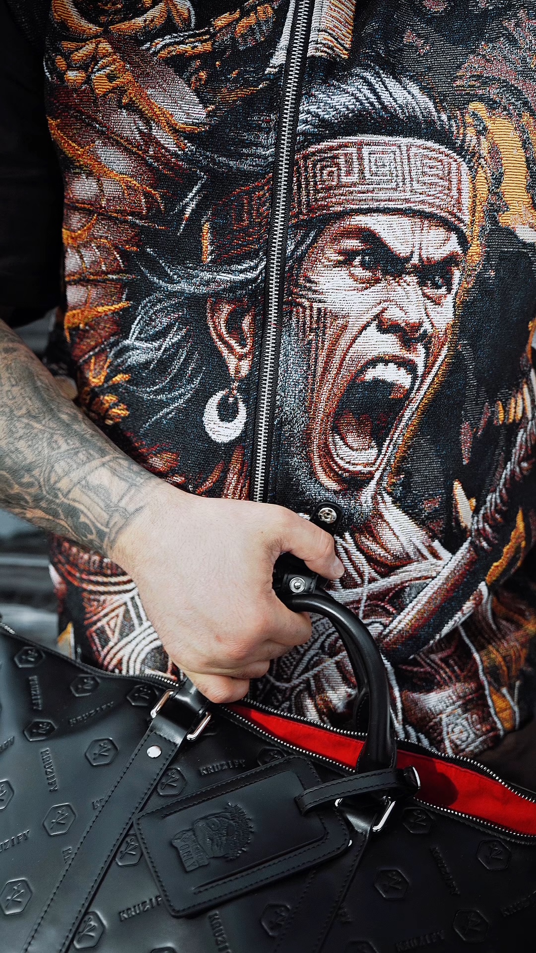 The Indigenous Vest is a storytelling piece rooted in strength, survival, and identity. Designed with a fully woven tapestry construction, every thread carries meaning — from the screaming warrior on the front to the commanding figure on the back.