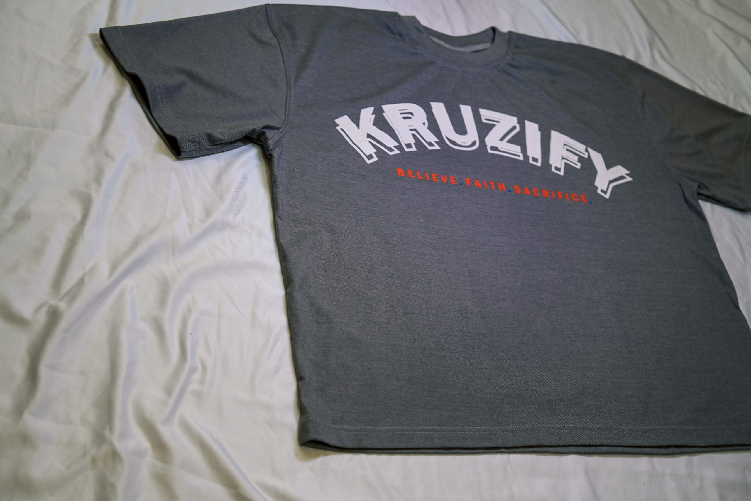Front: Bold KRUZIFY logo with the core values: BELIEVE. FAITH. SACRIFICE.