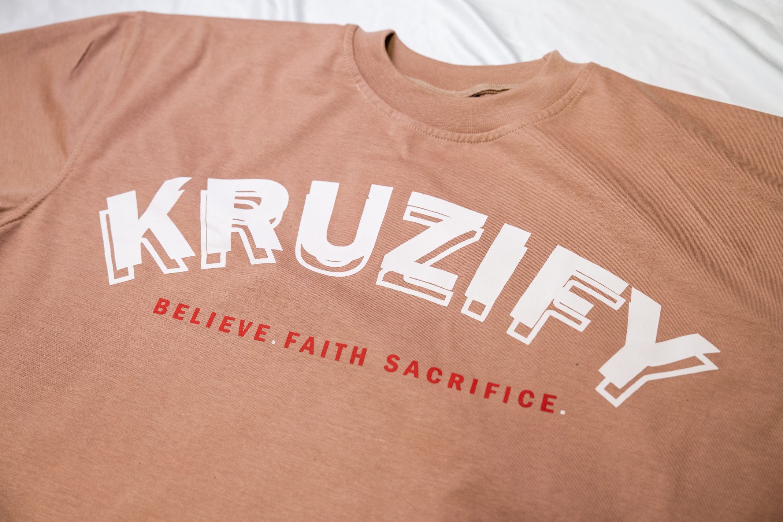 Front: Bold KRUZIFY logo with the core values: BELIEVE. FAITH. SACRIFICE.