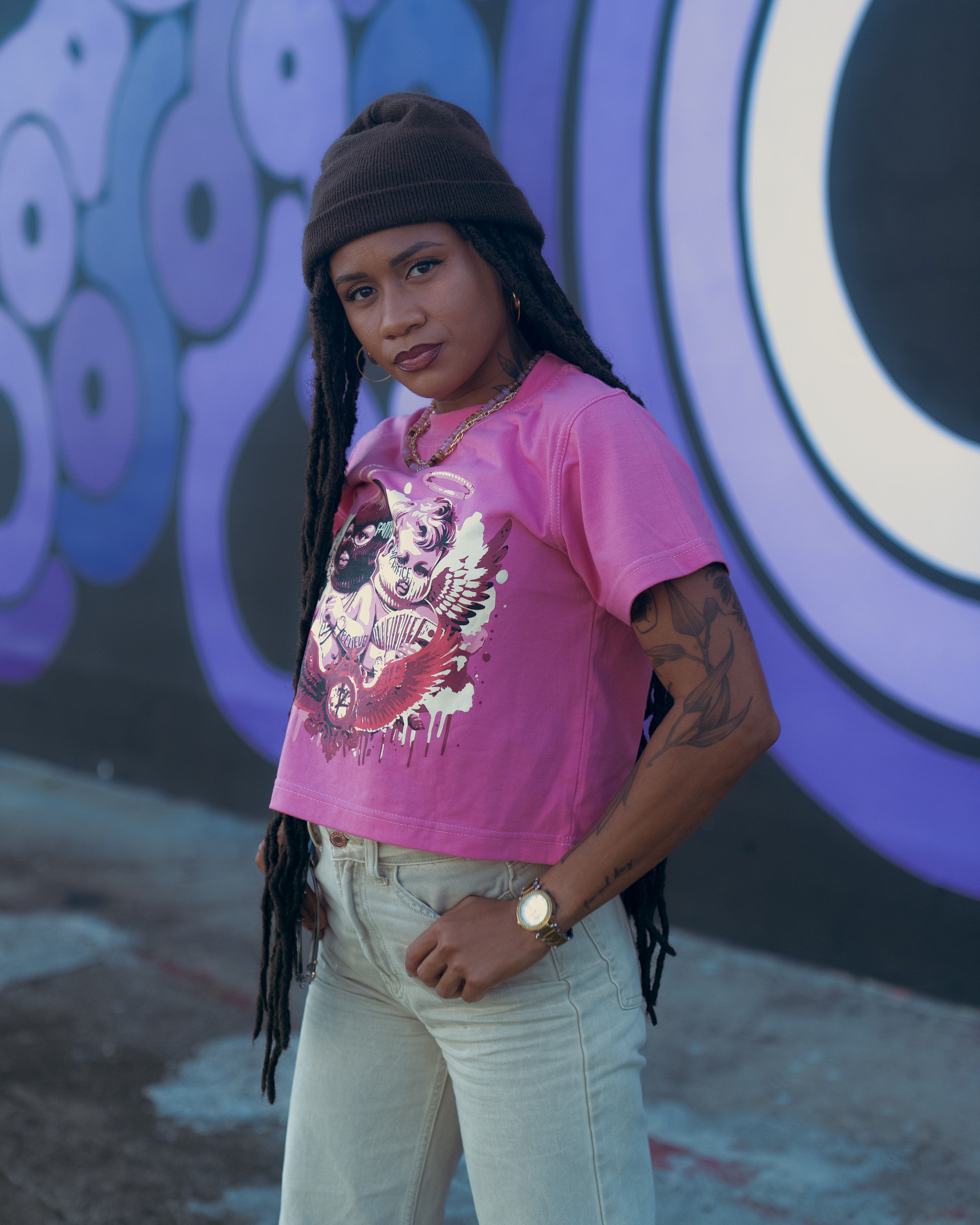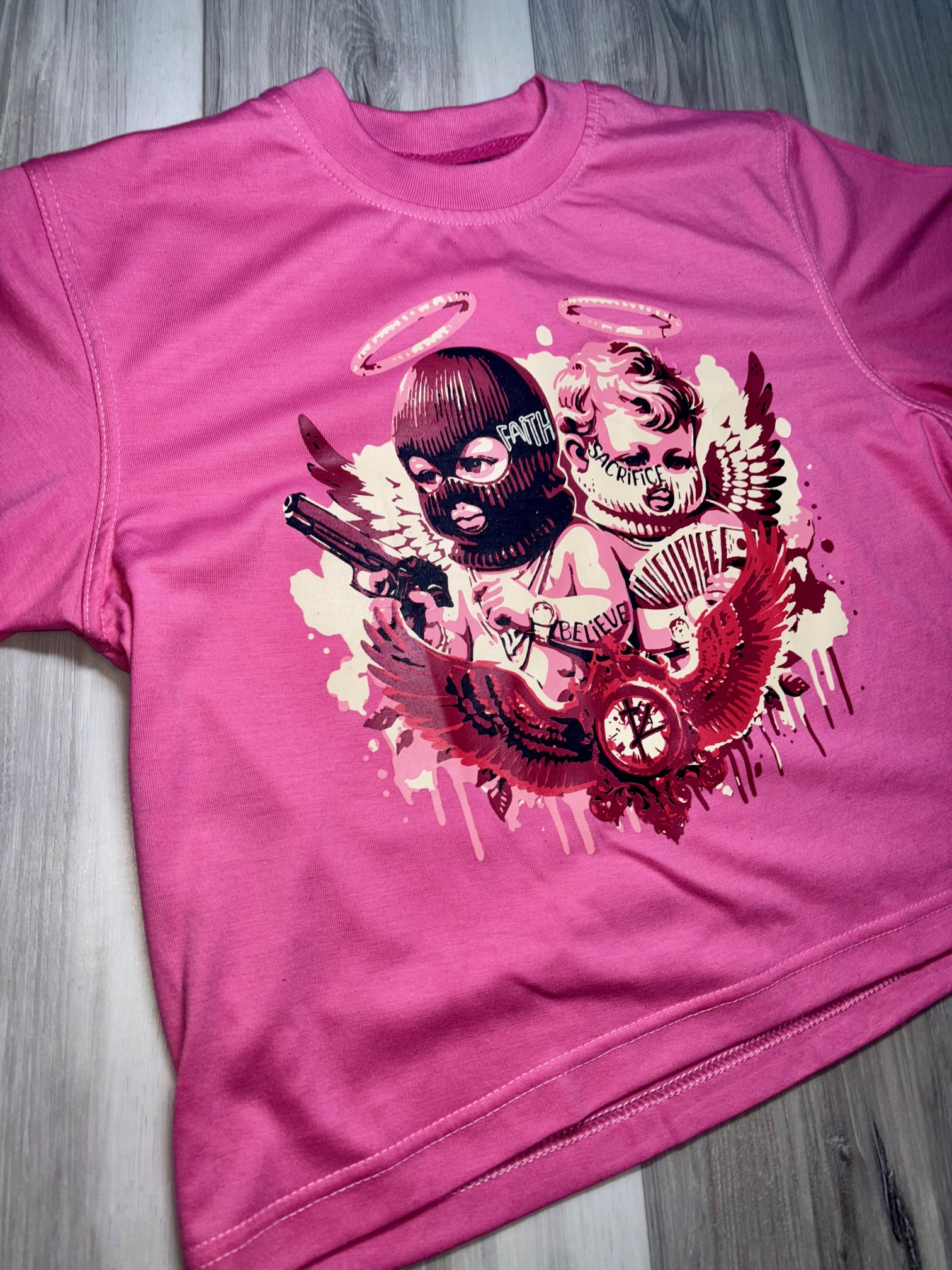 Drenched in symbolism and street gospel, the Saints & Sacrifices tee is a bold visual sermon. Featuring two angelic figures- One masked in grit, the other bathed in innocence- This designed speaks to the duality of faith and struggle. “BELIEVE. FAITH. SACRIFICE” isn’t just art- its the code we live by. Set on a vibrant pink canvas with heavenly halos, wings, and spiritual defiace, this piece fuses divine energy with street realism. For the ones who walk with purpose- this one’s for you.